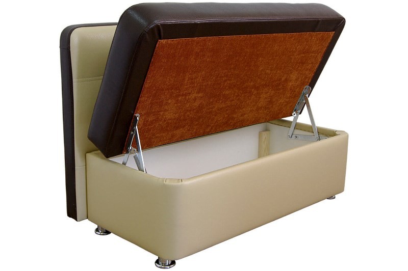 - Зачастую мини диваны оснащены вместительными потайными коробами, в которые при необходимости можно спрятать различные принадлежности: салфетки, полотенца, мясорубку, блендер и даже пакеты с крупами.