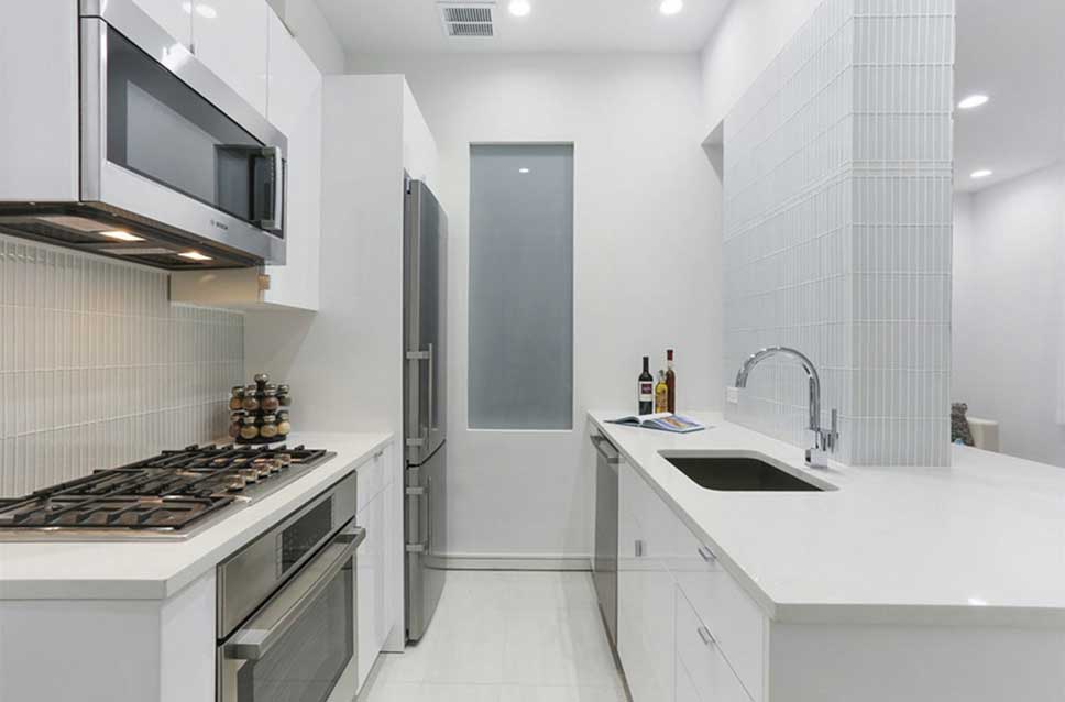 В некоторых случаях рациональнее всего располагать кухонную мебель вдоль двух параллельных стен.