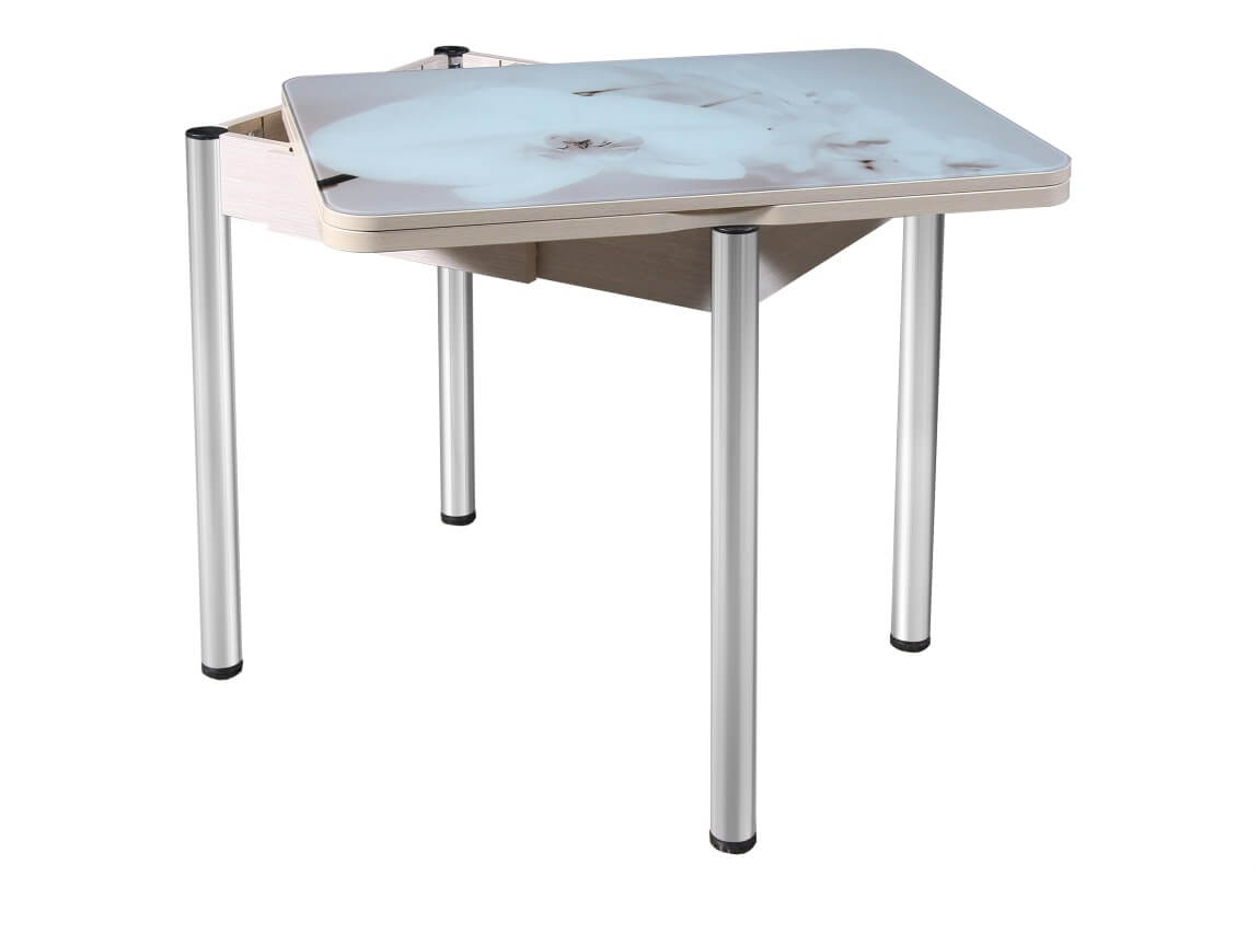 Стильный вариант столика-трансформера для небольшой кухни – стеклянная модель. Современные столы из стекла имеют отличные показатели прочности, удачно вписываются в любой интерьер и гармонируют с другими материалами (к примеру, стальными ножками или деревянной основой).