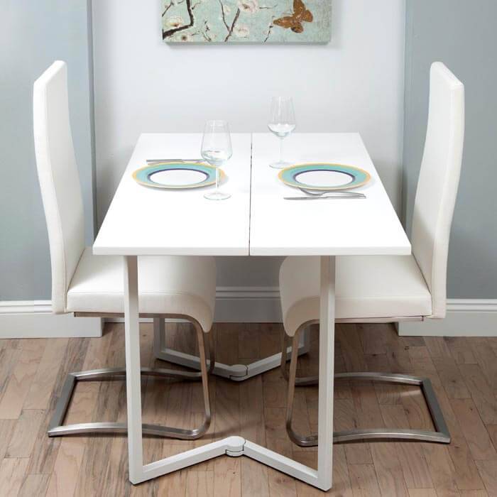 В советские времена были довольно популярны раздвижные конструкции обеденных столов. Одна часть столешницы отодвигалась, а в освободившееся пространство вставлялась дополнительная доска. Благодаря такому решению за столом могло поместиться больше едоков. Обычно такие конструкции устанавливались в гостиных, но они совершенно не подходили для кухни. Современные производители мебели предлагают компактные обеденные столы с раздвижной столешницей, предназначенные специально для небольших помещений.