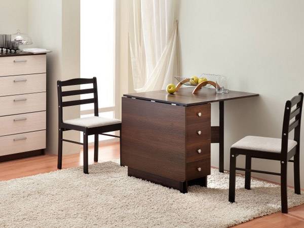 Чтобы стол-трансформер служил вам долгое время – еще при покупке обратите внимание на качество и прочность крепителей и фурнитуры, а также на эксплуатационные свойства основного материала. Самый распространенный и удачный вариант – компактные столики из ДСП