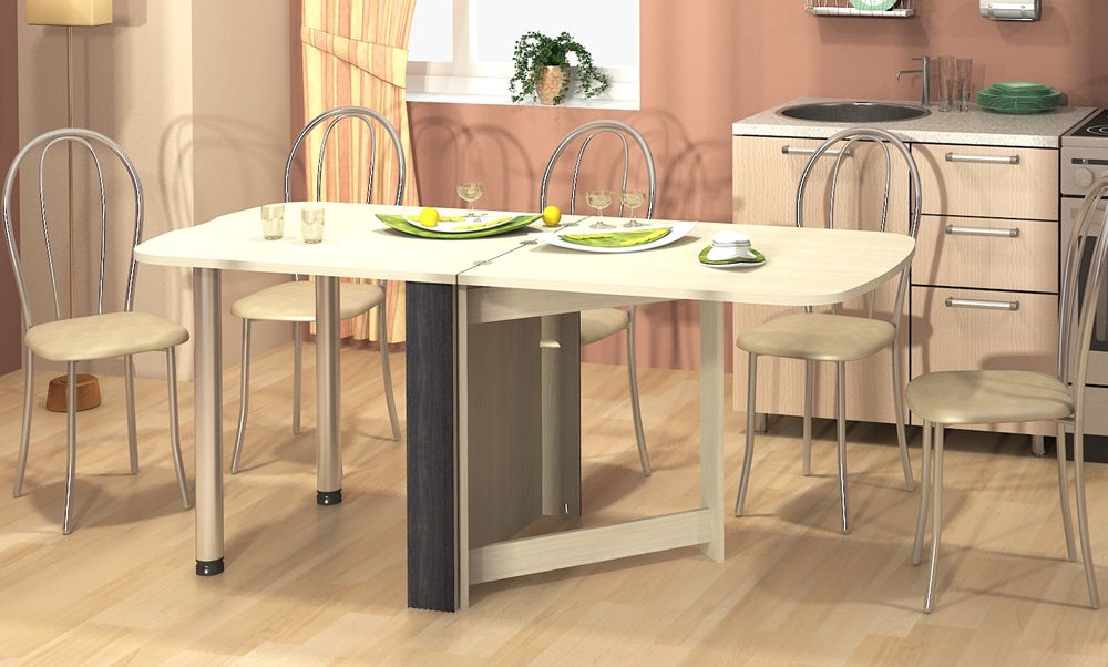 - Конструкцию. Тут нужно делать выбор между обычным и раскладным вариантом. Кухонный стол для маленькой кухни, имеющий возможность расширяться, – идеальный вариант.