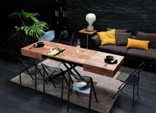 Деревянные столы постепенно уходят в прошлое: несмотря на долговечность, этот вариант не оправдывает своей высокой стоимости, так как может портиться от механических повреждений и других факторов. Современные столы с трансформационными свойствами все чаще создаются из пластика.