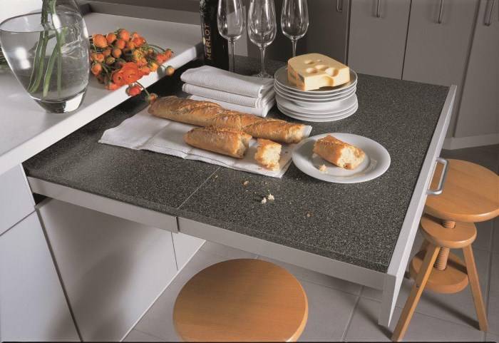 Ещё один вариант компактного кухонного стола — выдвижная столешница. Особенность заключается в том, что стол встраивается в нижний модуль кухонного гарнитура, пенал или подоконник. При необходимости, столешница легко выдвигается и вновь прячется обратно. Она может выкатываться на себя или в сторону. Недостатком является то, что стулья всё-таки придётся где-то прятать и хранить.