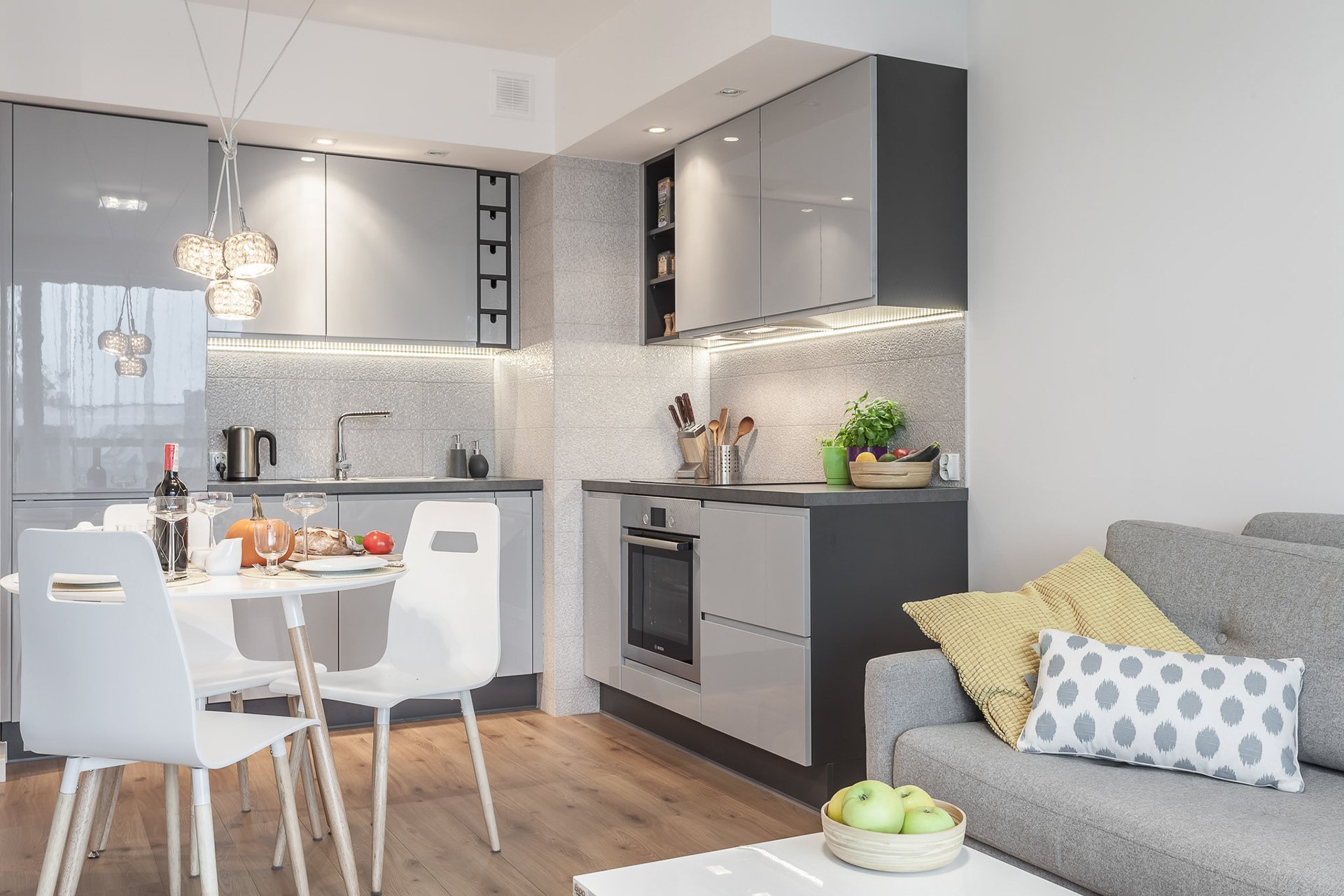 Для маленьких кухонь крайне важен правильный подбор гарнитура с учетом его функциональных особенностей и внешней подачи. Для улучшения дизайна помещения рекомендуется подбирать модели с глянцевыми фасадами.
