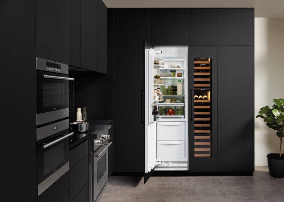- Подвесной агрегат, который находится на втором уровне кухонного гарнитура, позволит держать все продукты в поле зрения. Кроме того, холодильники на стене на кухне освобождают больше пространства в нижнем ярусе для крупной техники.