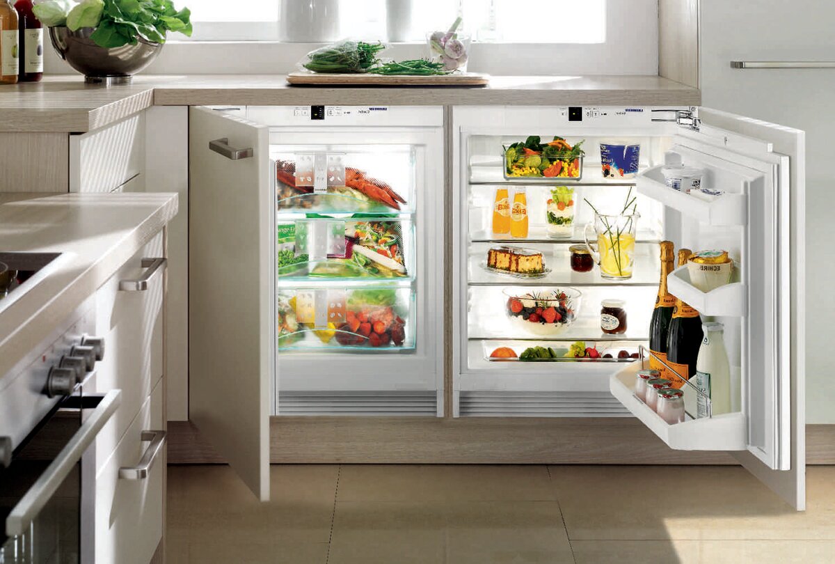 Если ваша кухня совсем крошечная, то советуем не использовать классический высокий холодильник, а «разбить» его на две камеры, которые можно спрятать под столешницу. Это также прекрасная идея для тех, у кого морозильная камера большую часть времени пустует, поэтому является практически бесполезной.