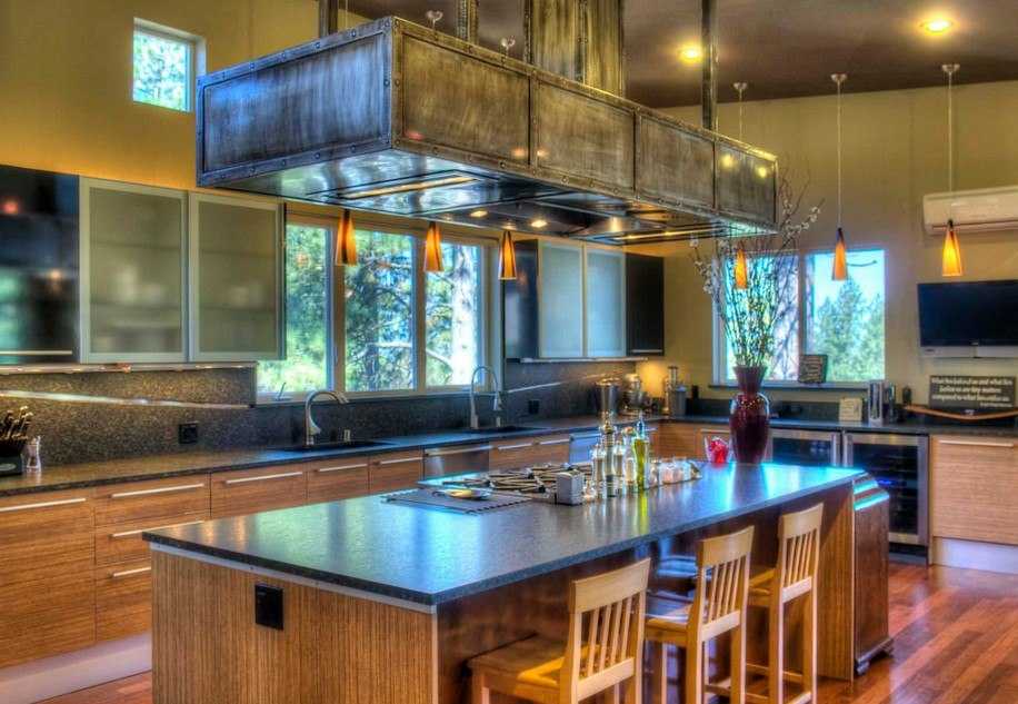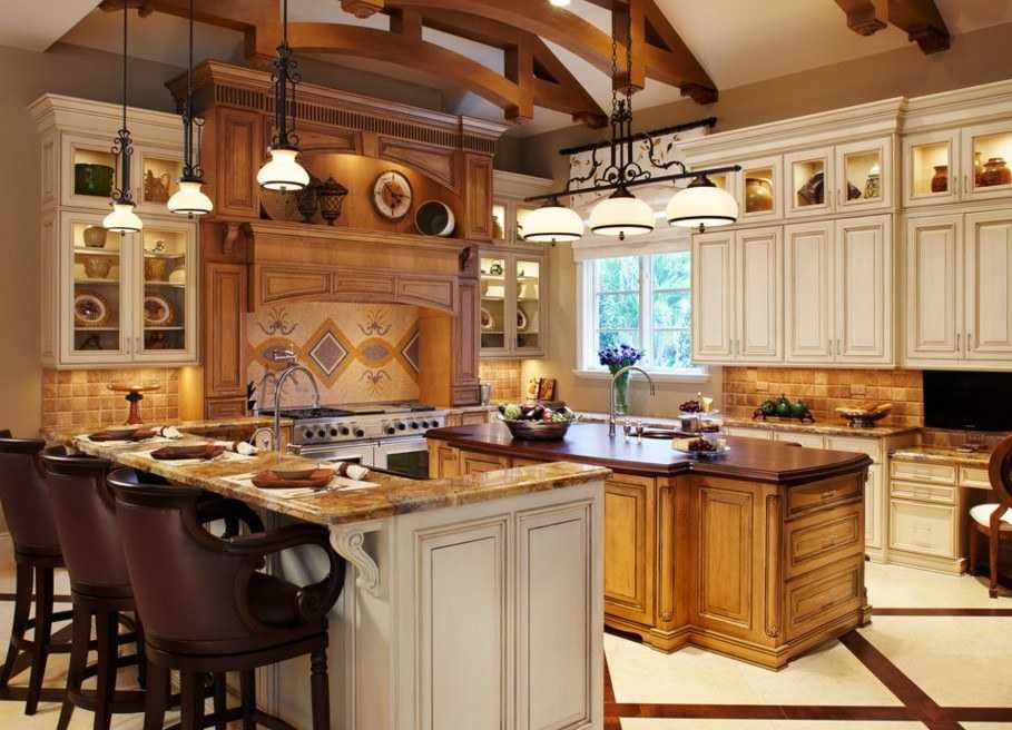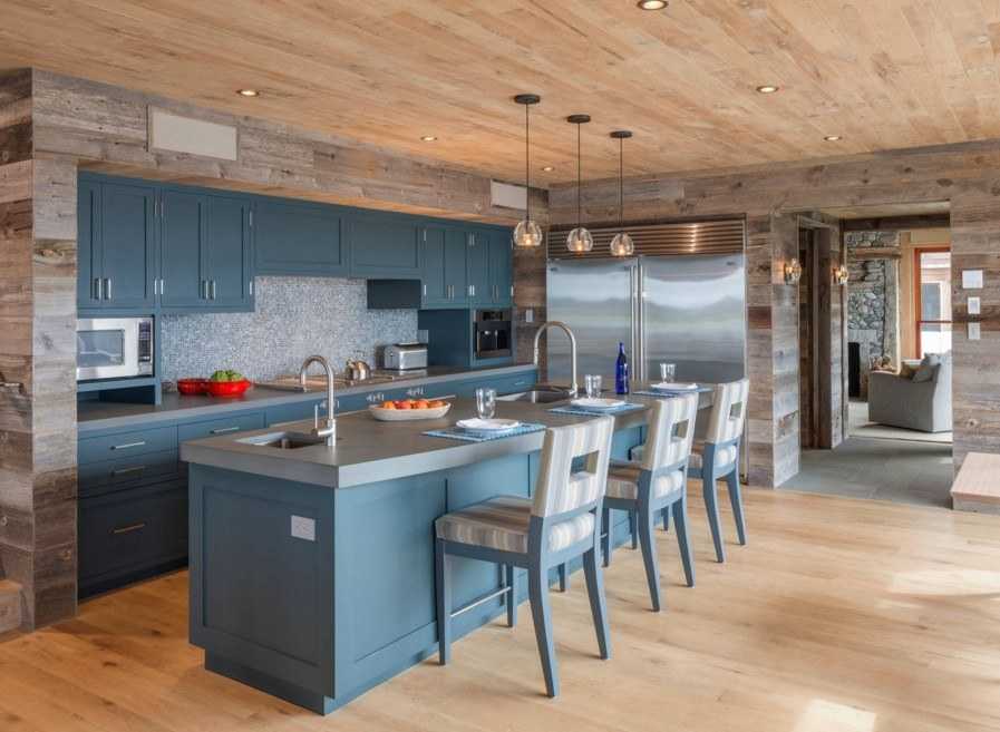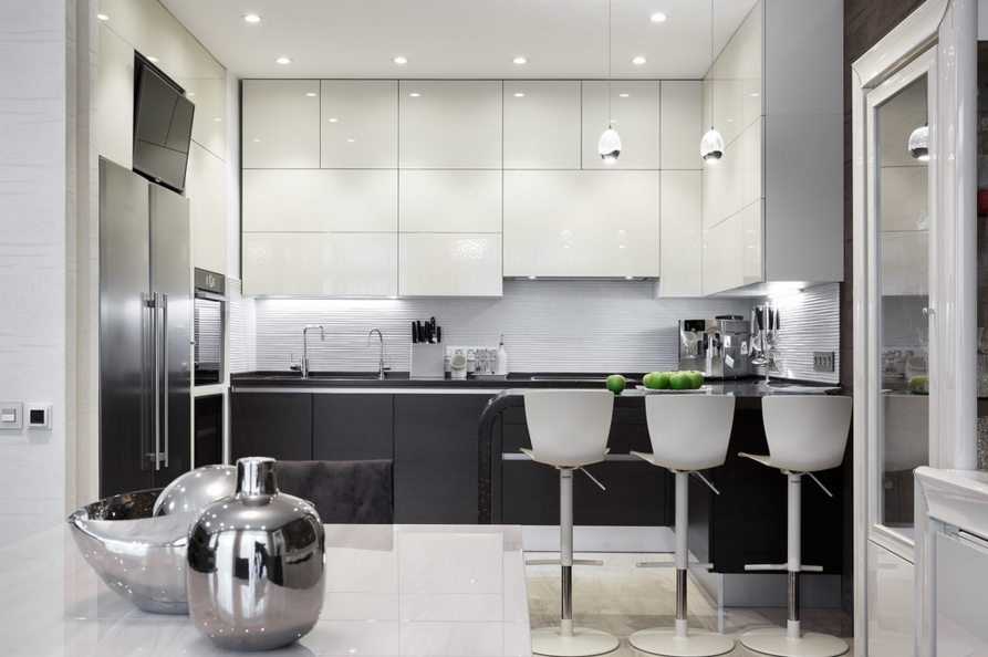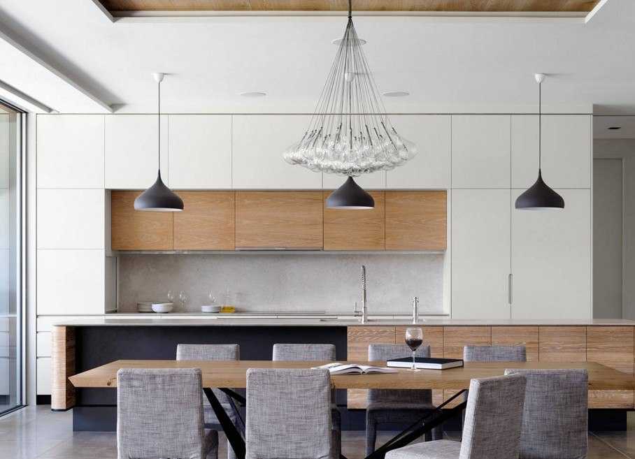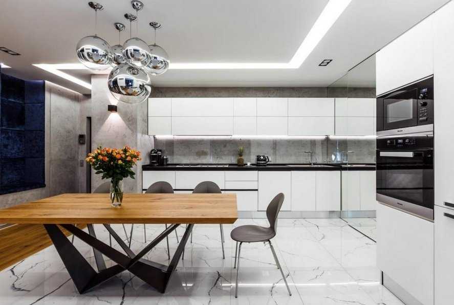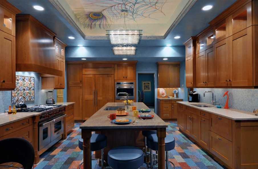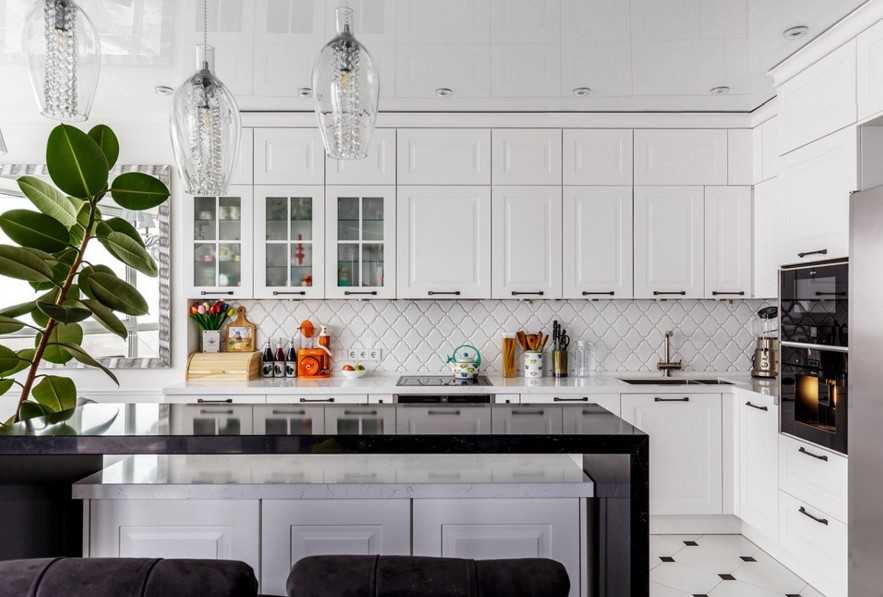 В интерьере кухни стоит использовать материалы, не впитывающие запахи и простые в уходе. Хорошим интерьерным решением станет натяжной потолок с фотопечатью или необычной формы. Например, оригинальная волнообразная поверхность над обеденной зоной или барной стойкой.