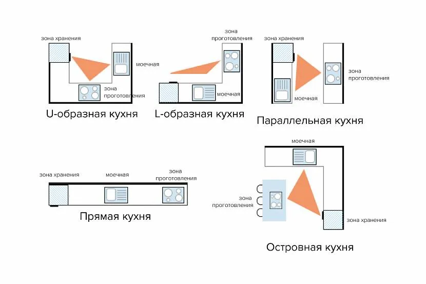 Что это значит? Три основные зоны — зона хранения (холодильник), зона подготовки продуктов (мойка) и зона приготовления пищи (плита) — должны находиться друг от друга не далее 1,5 метров.