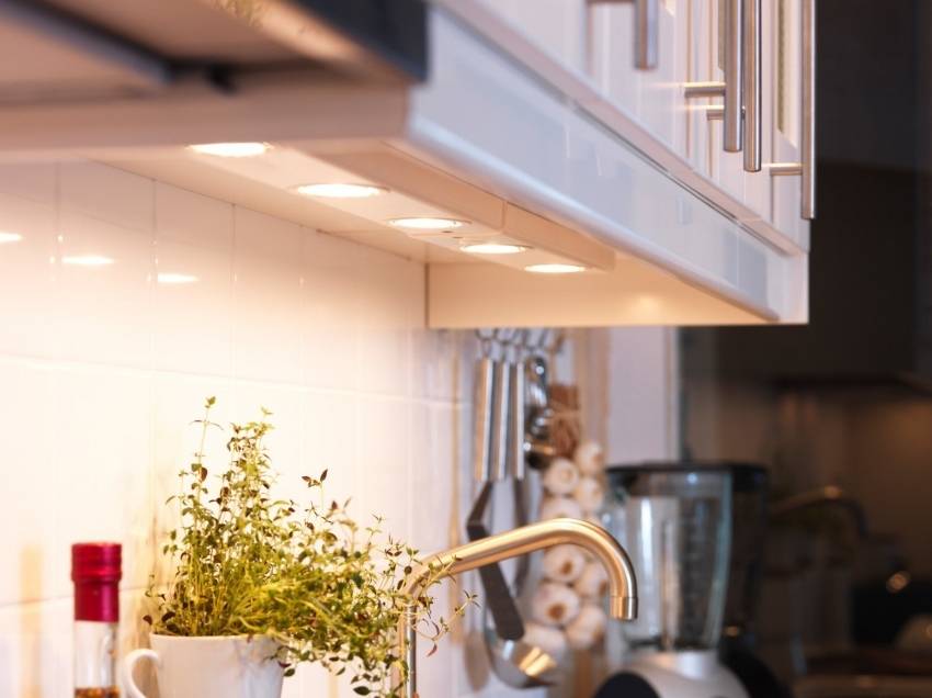 При выборе кухонного гарнитура, стоит обратить внимание не возможность установки дополнительного светодиодного освещения под шкафы