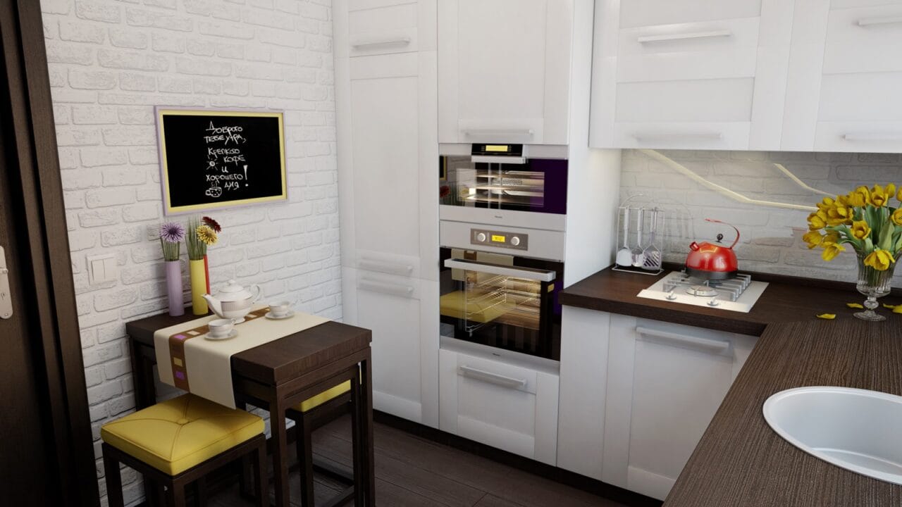 Мебель должна также соответствовать размерам кухни. Сюда подойдёт складной вариант гарнитура – быстро раскладываемые стулья, стол-трансформер, небольшой угловой шкаф. Все элементы должны быть продуманы и максимально эргономичны.