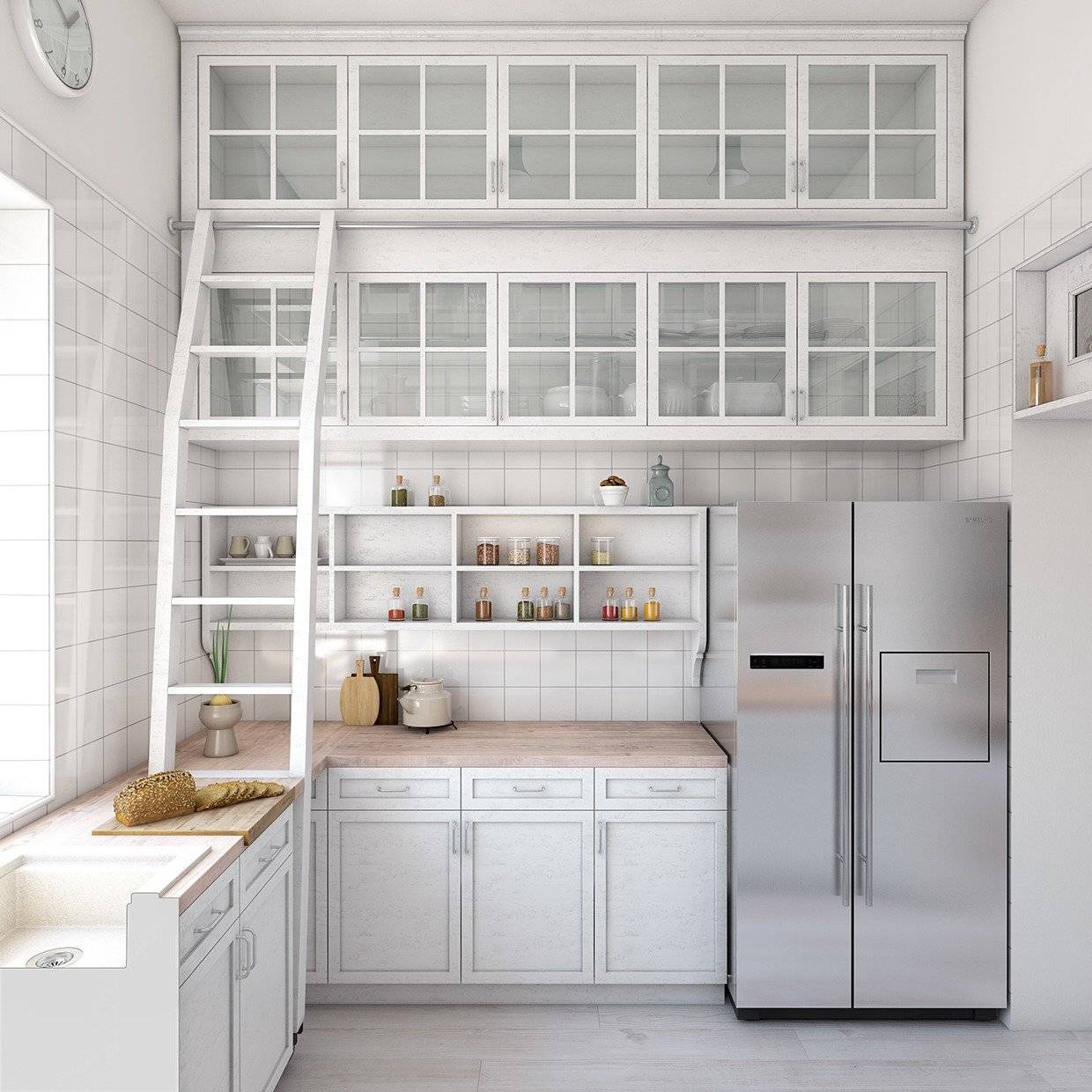Нередко в состав гарнитура для маленькой кухни входят шкафы-пеналы высотой до потолка, так как в них больше места. Но, с другой стороны, они способны загромоздить пространство. Кроме того, верхние отделения подходят только для редко используемых вещей.