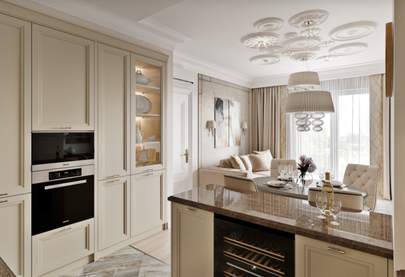 В классическом стиле следует выполнять помещение больших размеров. Например, дизайн бежевой кухни-гостиной. Просторная комната дает больше вариантов для отделки, здесь выбирают один акцент вокруг которого строится весь интерьер. Это может быть зона отдыха, камин или обеденный стол.