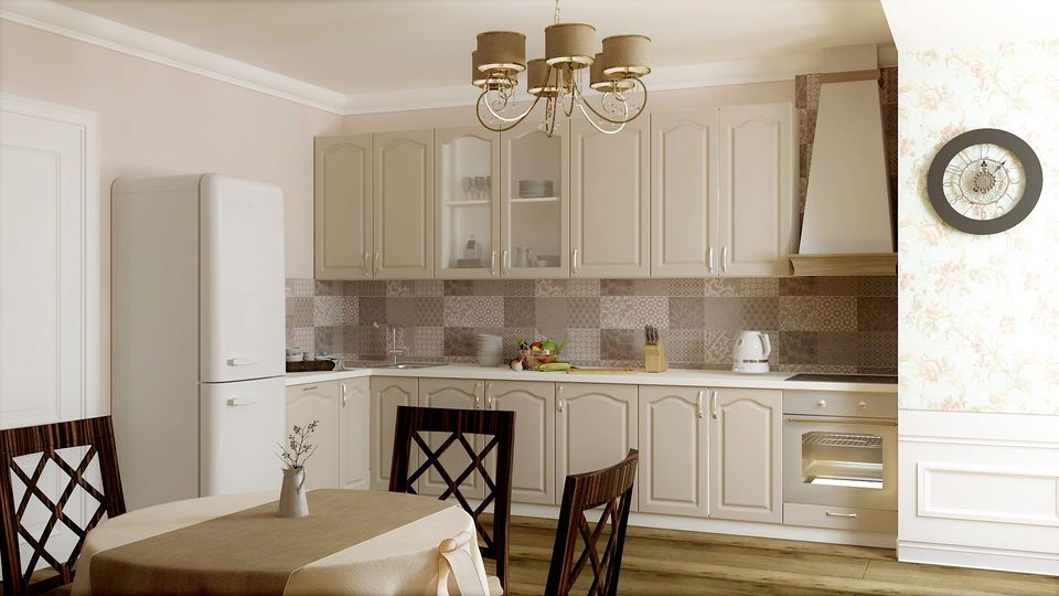 Классика всегда актуальна. В этом стиле может быть оформлено любое помещение, включая и кухню. Дизайн бежевой классической кухни отличается респектабельностью. Интерьер смотрится сдержанно, здесь нет места кричащей роскоши. Подчеркнут стиль деревянная глянцевая мебель и картины.