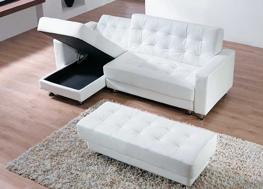 Угловой диван со встроенным ящиком для хранения белья отлично впишется в небольшую гостиную. При необходимости на нём можно разместить трёх человек.