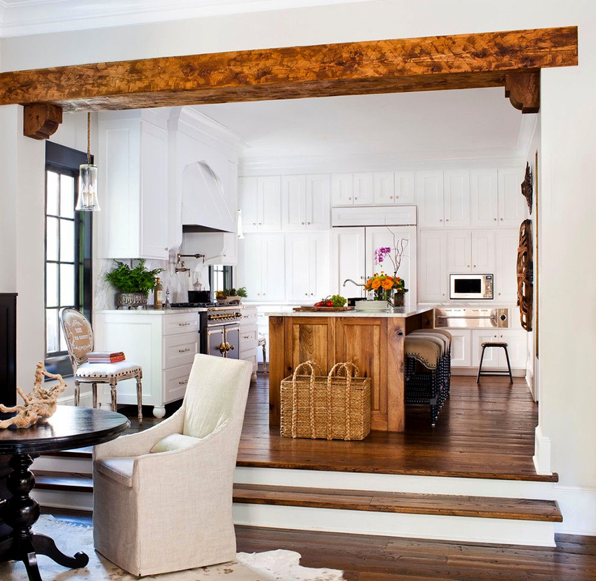 Маленькая кухня выиграет от использования побелки на потолке. Открытые потолочные балки отлично смотрятся на светлом фоне. И кухня, и гостиная в крошечной «хрущевке» преобразятся от такого тандема. Особенно если грамотно разграничить жилую и рабочую зону. Фото готовых интерьеров в конце статьи помогут разобраться в тонкостях зонирования пространства.