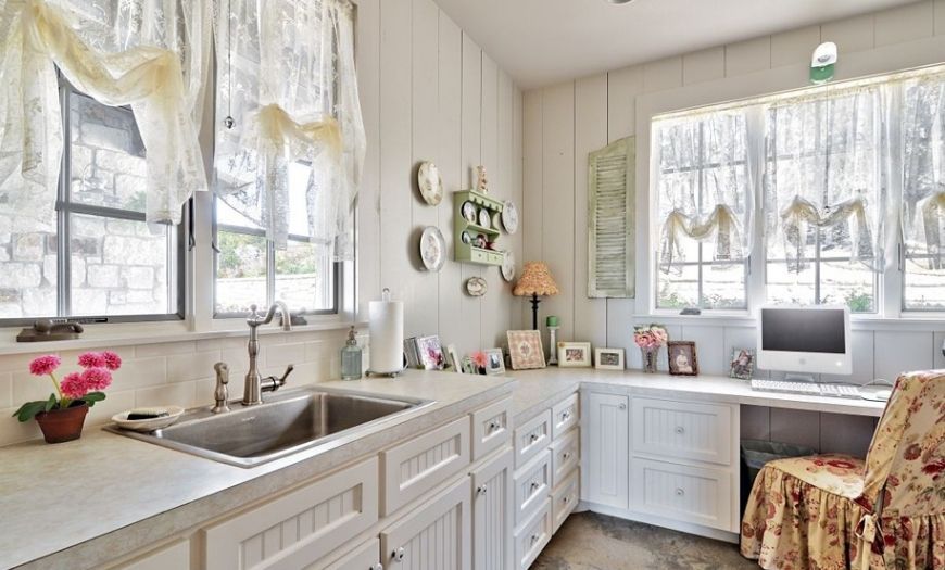 Окна стоит оформлять не только стильно, но и практично. Тканевые занавески шьются из легко отстирывающихся материалов. Также рулонные и римские шторы подойдут к данному интерьеру; существуют прованс-шторы, которые тоже будет уместно применять.