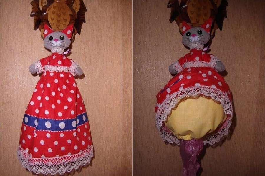 Кукла-пакетница своей роскошной юбкой маскирует мешочек с пакетами. Используя остатки любой ткани, можно украсить кухню. Пакетницы-зверушки можно шить так, чтобы фигурки были пригодны для домашнего кукольного театра.