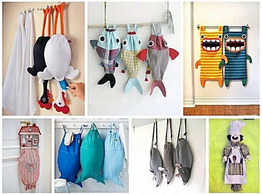 Вот несколько примеров самодельных органайзеров для хранения пакетов на кухне. Изделия необычные и оригинальные, любую курочку или мышку можно изготовить своими руками. А при желании интерьер кухни можно украсить рыбкой или смешным забавным ужастиком.