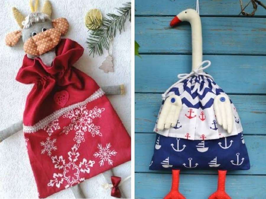 Еще фантазии на тему органайзеров для пакетов – мешочков и зверушек: корова и гусь в морском стиле.