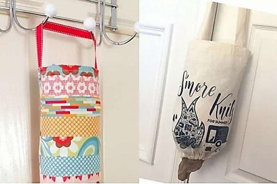 Варианты для тех, кто не хотел бы возиться с тканью и швейной машинкой. Картонная коробка из-под чего-либо крепится на обратную сторону дверцы шкафчика. Для удобного вытаскивания пакетов прорезается дырка в стенке коробки. Позже при желании можно оклеить ее цветной бумагой, обоями или пленкой-самоклейкой. Пластиковую бутылку из-под воды можно прикрепить в любом месте. Дно следует обрезать, чтобы вкладывать туда пакеты, и вытаскивать через горлышко.