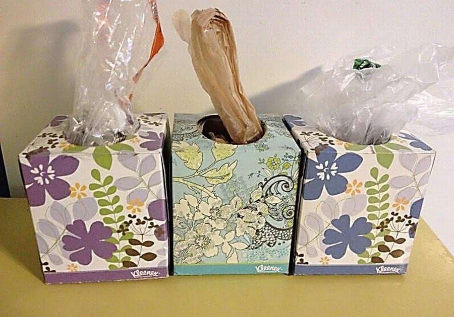 Органайзер для пакетов из коробок от салфеток. Практически готовый аксессуар можно сразу использовать, но для красоты можно и поработать над ним слегка своими руками. Чем-нибудь декорировать, например, или соединить вместе несколько упаковок для пакетов разной величины или цвета.