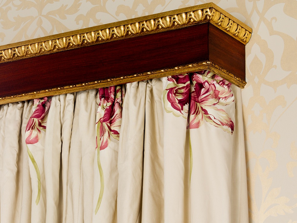 Эти изделия включают в себя, кроме самого карниза, декоративную пластину, закрывающую верхнюю часть шторы и крепления, скользящие по профилю. На сегодняшний день, производители предлагают огромное разнообразие багетов с декоративным покрытием, как по материалу (изготавливаются из дерева, пластика или металла), так и по ширине изделия.
