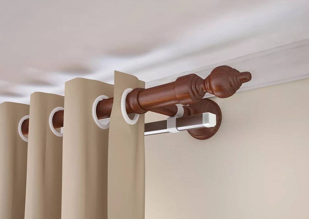 Крепление к стене снимает вопрос о том, как зафиксировать карниз в тех случаях, когда потолок оформлен гипсокартоном или натяжным полотном. Не потребуется никаких закладных конструкций или усиления каркаса – кронштейны, на которых держится гардина, монтируются на стене и справиться с этим сможет любой кто хоть раз держал в руках обычную дрель.