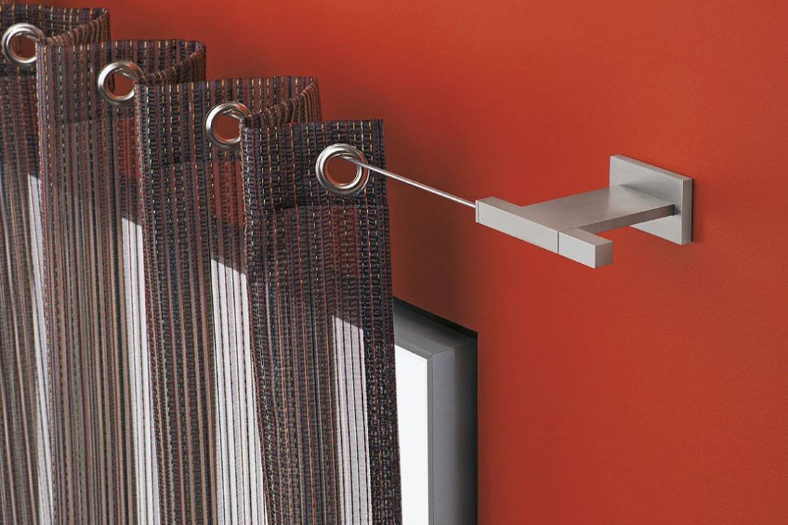 - Трубчатая — Один из самых распространенных видов карнизов, представляет собой трубу с круглым сечением, расположенную на кронштейнах. На этой штанге могут быть расположены петли или кольца, либо люверсы. Классическая конструкция, широко распространенная.