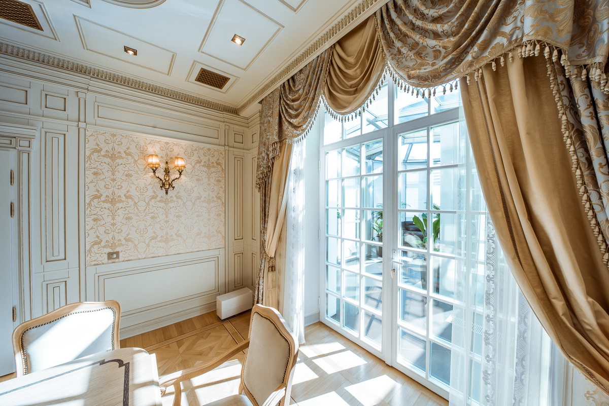 Стоит уделить внимание такому фактору, как тяжесть шторы. Хотя украшение интерьера тяжелыми тканями позволит дополнительно защитить от проникновения холодного воздуха, все же использовать для тяжелых штор мягкие виды карнизных систем (например, из пластика или мягкого металла) нежелательно