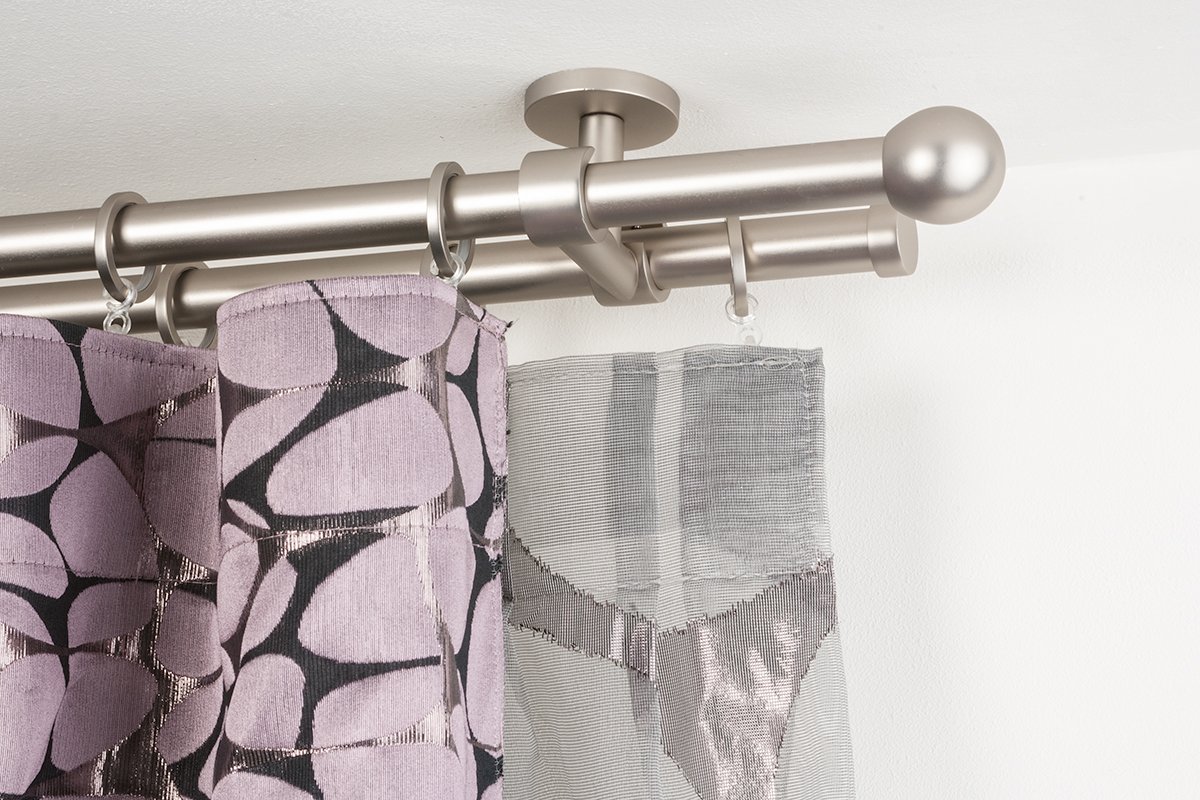 Этот тип подвеса является элементом украшения кухонного помещения, поскольку занавеси его не прикрывают. Диаметр штанги варьируется в зависимости от тяжести штор. На краях изделия обязательно присутствуют декоративные наконечники всевозможных форм и конфигураций. Подобный карниз гармонично вписывается в разные стили кухонь – от классики до модерна. Все зависит от материала, расцветки и наличия соответствующих декоративных элементов. Штанга крепится к стенам и к потолку. Данный тип изделия часто используется в многорядных модификациях.