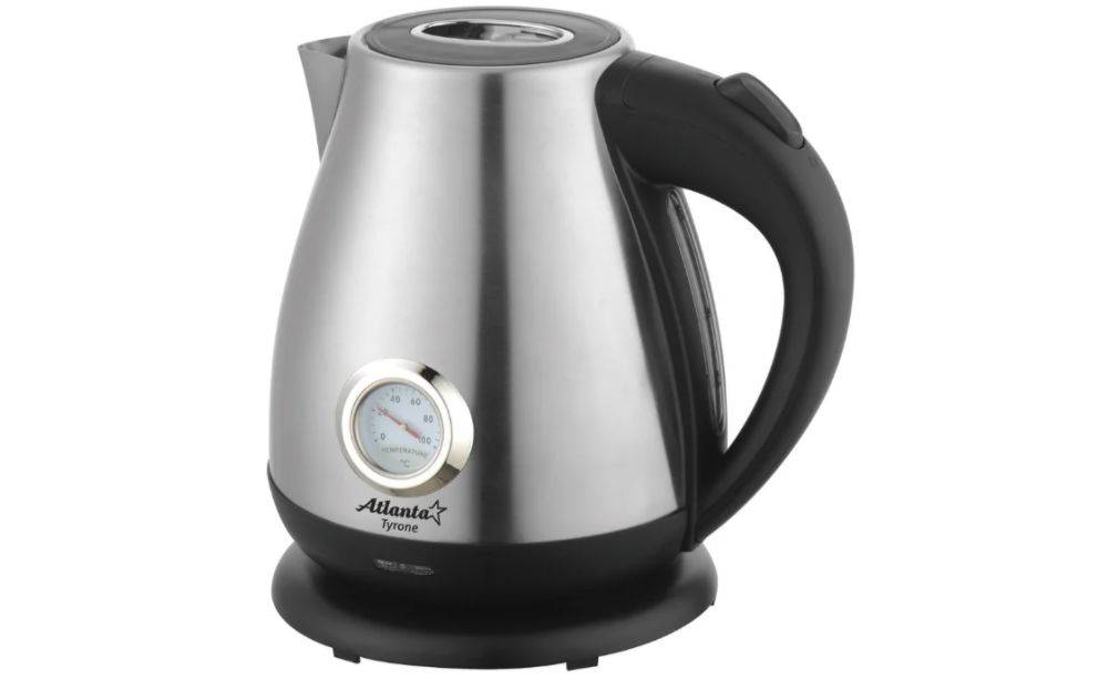 Открывает наш обзор металлический электрический чайник Atlanta ATH-2438. Это универсальное бытовое устройство для кипячения и подогрева воды. Он способен вместить до 1.7 литров, будет незаменим в большой семье или рабочем коллективе. Этот мощный прибор (1850-2200 Вт.) выполнен из высокотехнологических безопасных материалов с закрытым нагревательным элементом. Электрочайник оснащен биметаллическим термостатом, что является несомненным преимуществом. На корпусе установлен термометр, который показывает температуру воды. Это удобно, если вы готовите напитки, для которых требуется определённая температура воды, например зелёный чай, кофе и т.д. Также предусмотрено автоматическое отключение электроприбора сразу после закипания воды. Форма подставки обеспечивает возможность установки на нее изделия с любой стороны и его вращения на 360 °.