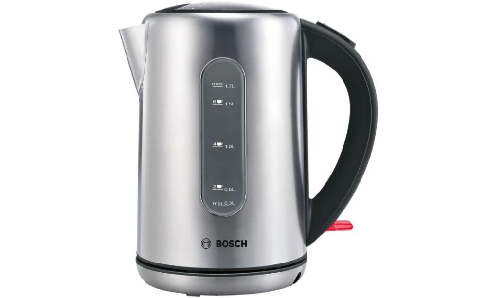 Bosch TWK79B05 выполнен в серебристом корпусе из прочного и надежного материала – нержавеющей стали. Это обусловливает долговечность прибора. Модель оборудована скрытым нагревательным элементом, мощность которого достигает 2200 Вт, что позволяет ему быстро справляться с нагреванием воды. При закипании воды активируется автоматическое отключение устройства, что обеспечивает комфорт и безопасность пользования. Bosch TWK79B05 является очень вместительным, с внутренним объемом 1.7 л. С двух сторон устройства предусмотрены прозрачные окошки с нанесенной на них мерной шкалой, что позволяет определить уровень воды, чтобы при необходимости долить жидкость в колбу. Модель предусматривает встроенный световой индикатор работы, что позволяет определить состояние прибора. Электрочайник поддерживает защиту от перегрева, поэтому нагревательный элемент модели будет служить очень долго. Вращение корпуса на подставке поможет пользователю легко устанавливать прибор.