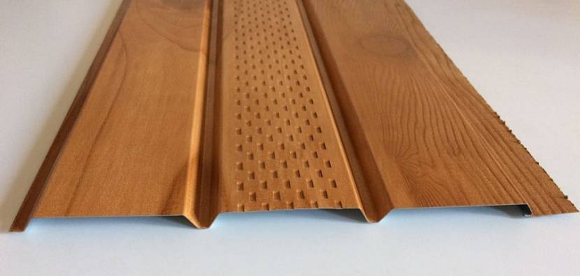 По материалу изготовления она подразделяется на два вида. Одни производители в качестве сырья используют ПВХ, другие тонкие листы меди, стали или алюминия, покрытие защитной полимерной пленкой. Она тоже может иметь разный состав. В качестве защитного слоя может использоваться пластизол, полиэстер или пурал. Разные покрытия определяют разные сроки службы изделия. Но, в общем, изделия из металла служат дольше, чем пластиковый сайдинг. Преимущества покупки металлического софита очевидны: можно купить сайдинг разных цветов, есть возможность использовать софиты под дерево. Они не бояться ультрафиолета, не выгорают на солнце, поэтому данный вид отделки считается, сегодня самым качественным и современным.