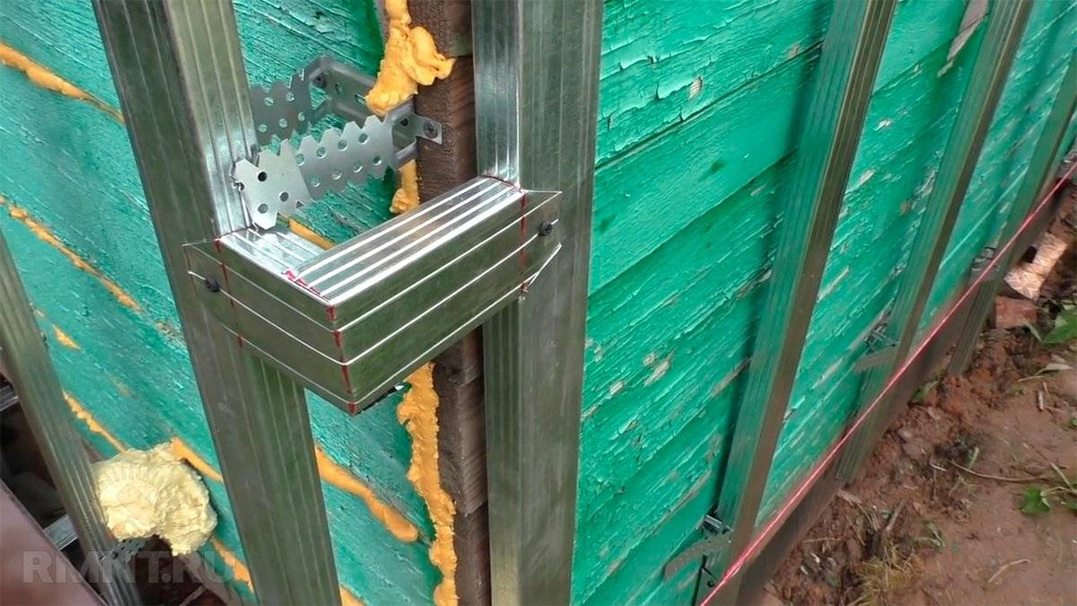 Под и над оконными проёмами в соответствии с уклоном отлива и рассветом откосов крепятся горизонтальные перекладины, которые нужны для закрепления обрамляющих профилей. Если на окна будут монтироваться рольставни, стойки по бокам проёма усиливают брусом 40х60 мм, вставленным внутрь профиля. В местах установки стыковочных накладок крайние стойки скрепляют между собой горизонтальными перекладинами с шагом в 40 см. Такое же усиление требуется и на углах: крайние стойки скрепляют между собой вставками, согнутыми из обычного профиля под 90°, при этом складки полок в месте сгиба обязательно нужно скрепить саморезами.