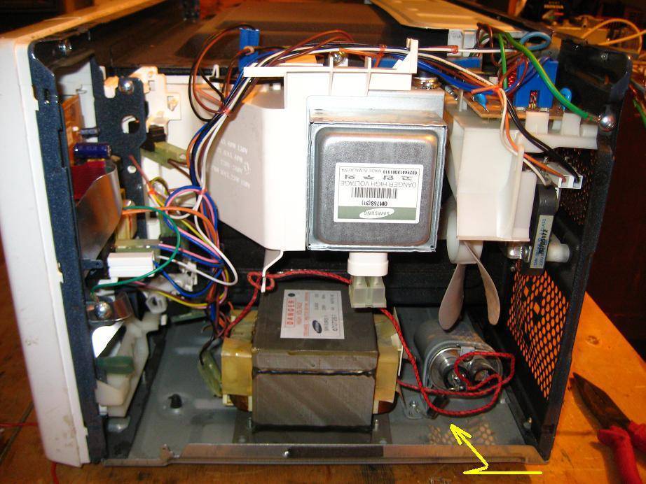 Прежде чем вскрыть кожух печи, следует отключить ее от питающей сети. После снятия кожуха, надо разрядить высоковольтный конденсатор. Для этого взять отвертку с изолированной ручкой и замкнуть вывод конденсатора, к которому присоединен высоковольтный диод, на корпус печи.