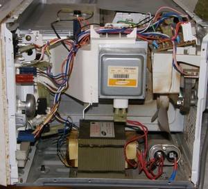 Чтобы проще было ремонтировать СВЧ печь, ознакомимся хотя бы в общих чертах с ее устройством. Больше всего нас интересуют ее «внутренности».