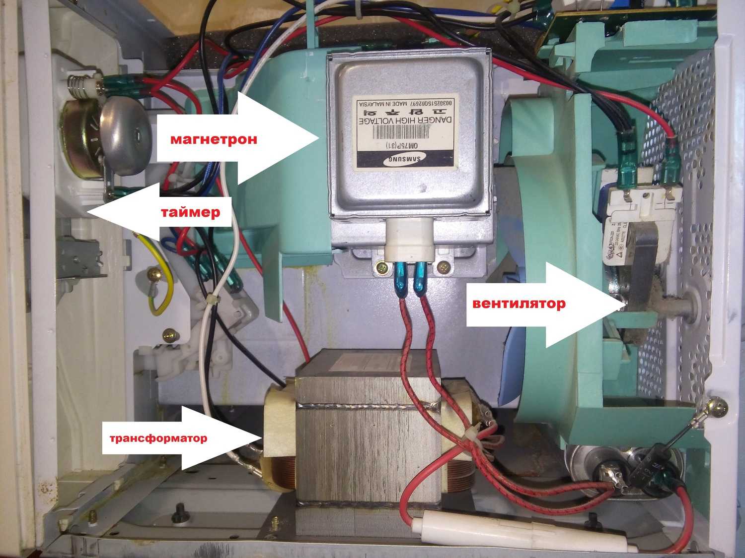 За выработку микроволн отвечает магнетрон, соединяющийся с камерой волноводом. Эта деталь в некоторых микроволновках закрывается пластиковой панелью или куском слюды. Диод, конденсатор и трансформатор отвечают за питание магнетрона. Высоковольтный предохранитель устанавливается в конструкции, чтобы защитить рабочие детали от перегрузки. Охлаждается магнетрон вентилятором. В рабочую камеру частично попадает теплый воздух, помогая быстрее пище прогреваться.