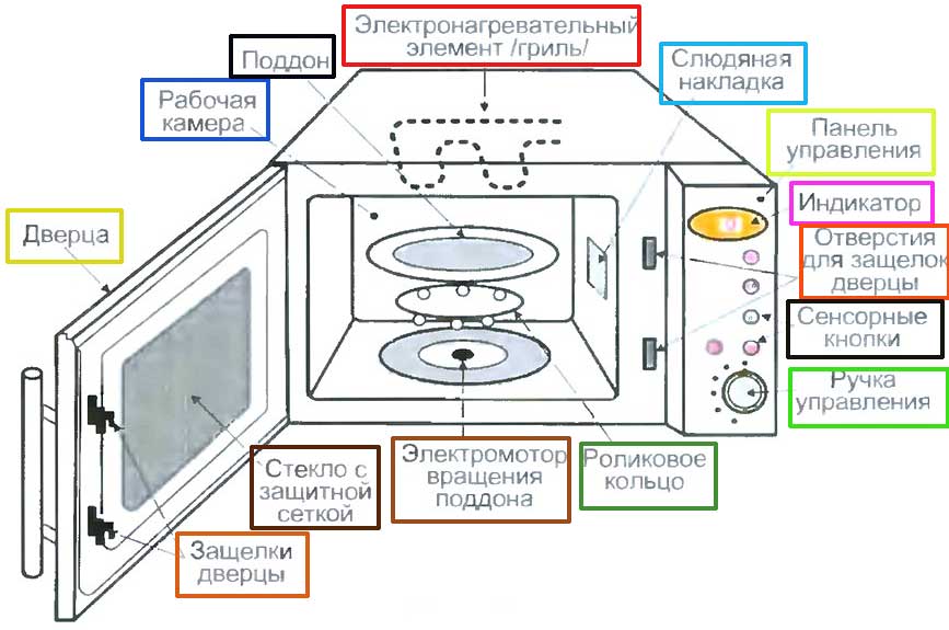 Надо рассказать отдельно о переключателях для фиксации закрытой двери. Когда микроволновка перестала греть, стоит проверить, плотно ли закрыта дверца. Питание подается только после того, как блокировка сработает. При нажатии кнопки открытия мгновенно прекращается подача питания. О панели управления нельзя писать конкретно, потому что каждый производитель предлагает свой вариант. Есть модели с грилем, с функциями запекания и размораживания.