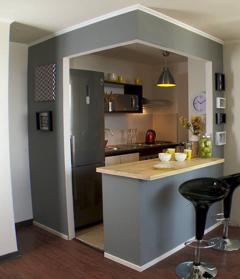 Пространство, где миниатюрный гарнитур имеет формы, удобные для углового расположения, приобретает современное звучание. Такая компоновка увеличивает полезную площадь, обеспечивает свободный доступ ко всем рабочим элементам мини кухни с двух сторон. В таком случае можно увеличить количество откидных деталей, помогающих при необходимости устанавливать барную стойку, дополнительный стол или сидячее место. Усиливает многофункциональность мини кухни установка ее перпендикулярно к стене с выводами коммуникаций, образуя границу между зонами.