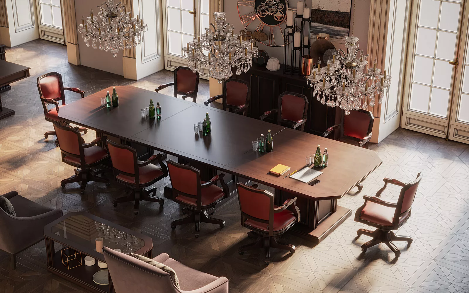 Офисная мебель должна быть износостойкой, удобной, неприхотливой в уходе. С умом подобранные стулья для переговорной комнаты вписываются в обстановку, не отвлекают от совещательного процесса дизайнерскими изысками, обилием регулировочных настроек. Штабелируемые (складные) стулья — эргономичны и удобны в плане хранения, конференц-кресла на полозьях — лаконичные, стильные, поддерживают конгруэнтность минимализма, хай-тека, модерна.