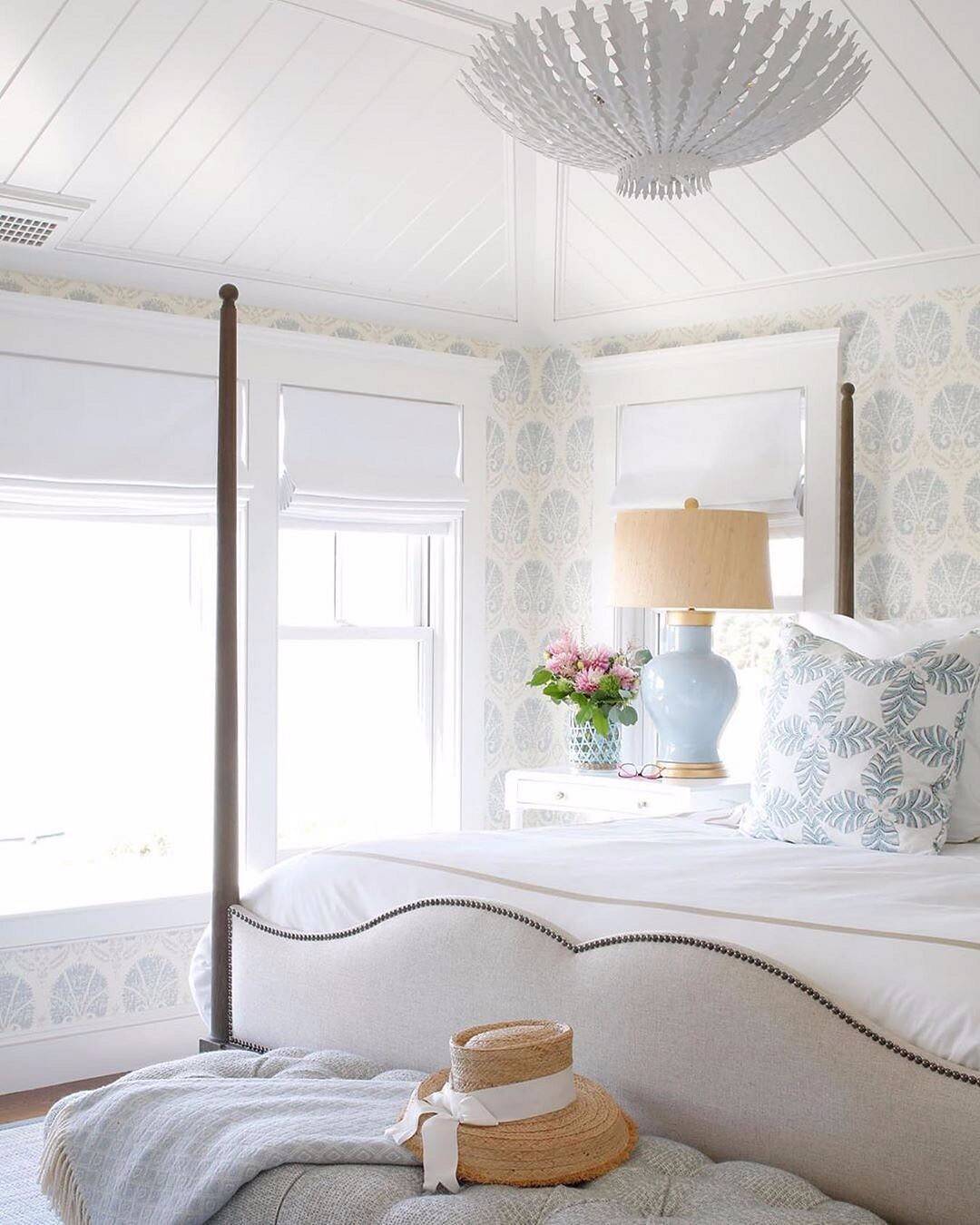 пастельная база и акцент с цветочным принтом в рамках на стене в спальне