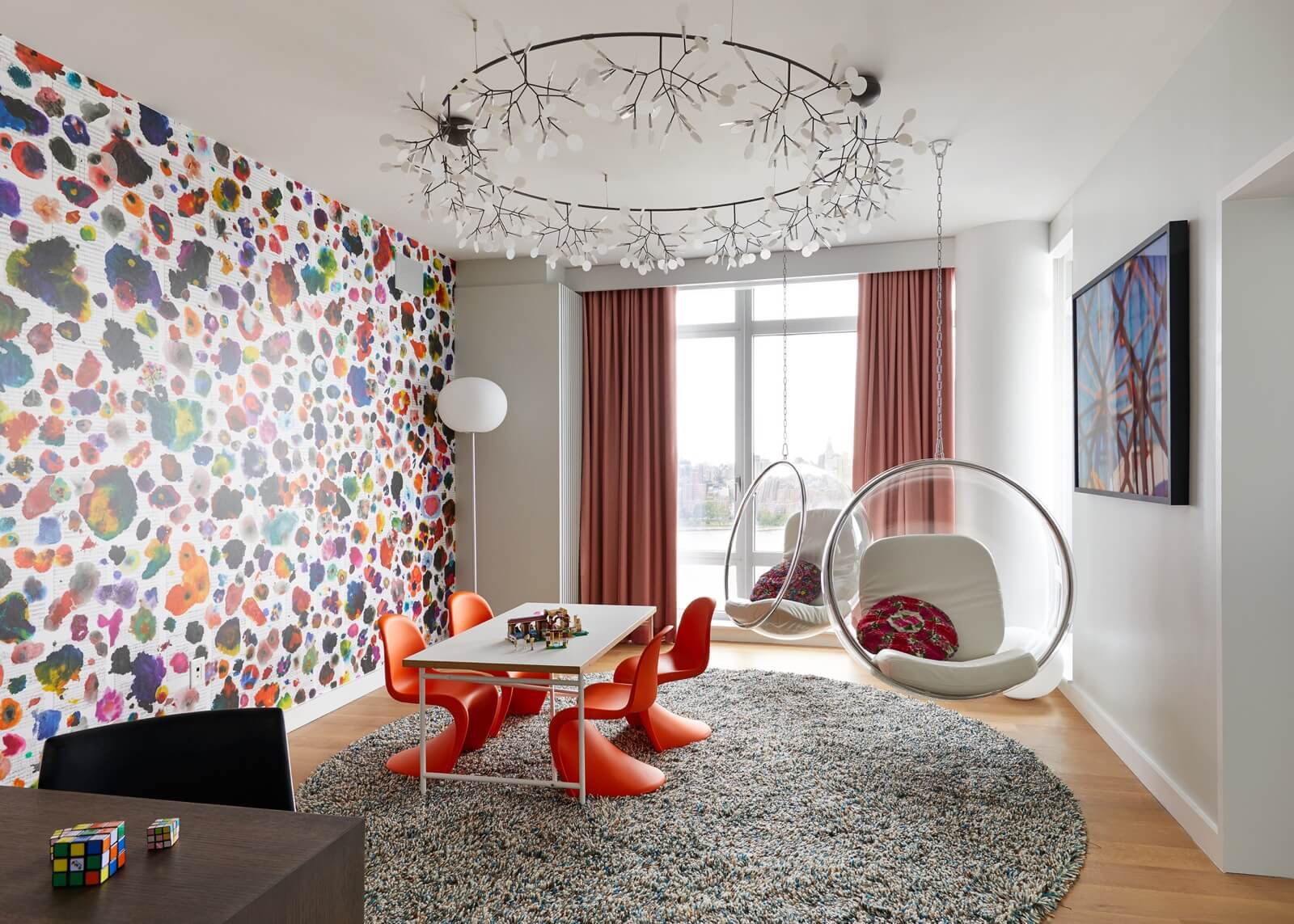Разноцветные точки тоже хорошо подойдут в качестве обоев для девичьей комнаты. Они могут сделать интерьер веселой, позитивной атмосферой, а это сделает время игры и отдыха ребенка приятным. Однако будьте осторожны, не переусердствуйте — мелкие точки контрастного цвета, распределенные на большой площади, могут вызвать оптические иллюзии и даже после длительного нахождения в комнате могут стать причиной недомогания.