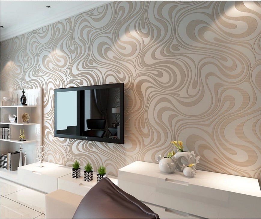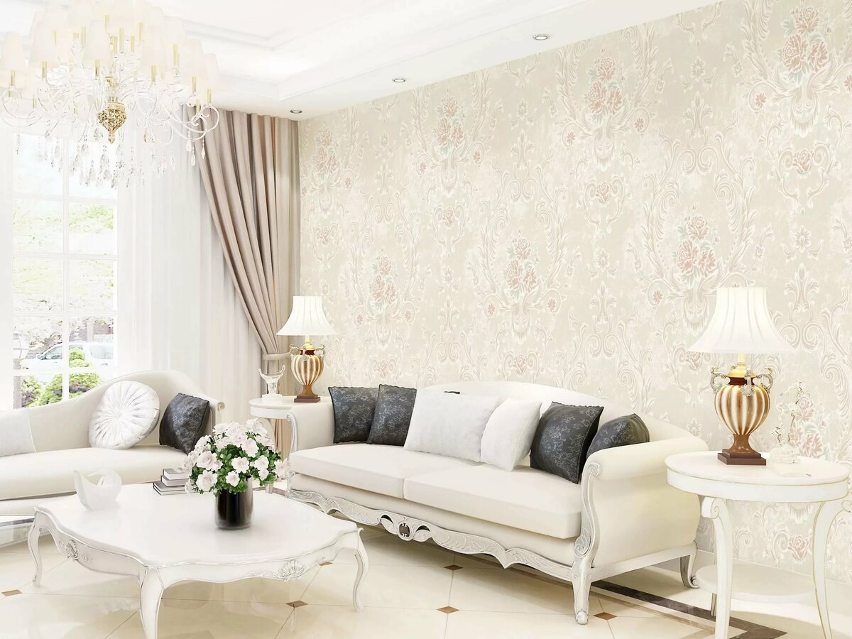 нейтральные светло-бежевые фактурные обои на стене в гостиной