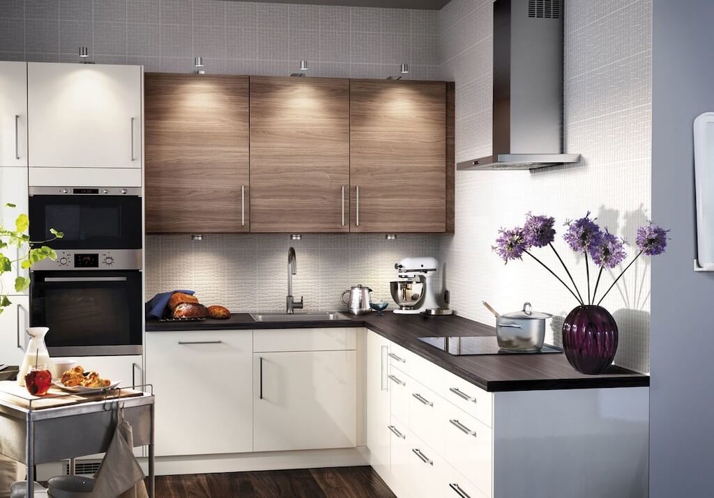 Каждый элемент кухонной мебели выполняет свои функции, поэтому есть несколько типов шкафов. Навесные, неглубокие и занимающие меньше места, размещают на стене. Напольные нередко служат для встраивания техники, а их верхняя поверхность используется в качестве рабочей зоны. Шкафы-колонны представляют собой комбинированный вариант, хотя такие кухонные модули для маленькой кухни не подходят.