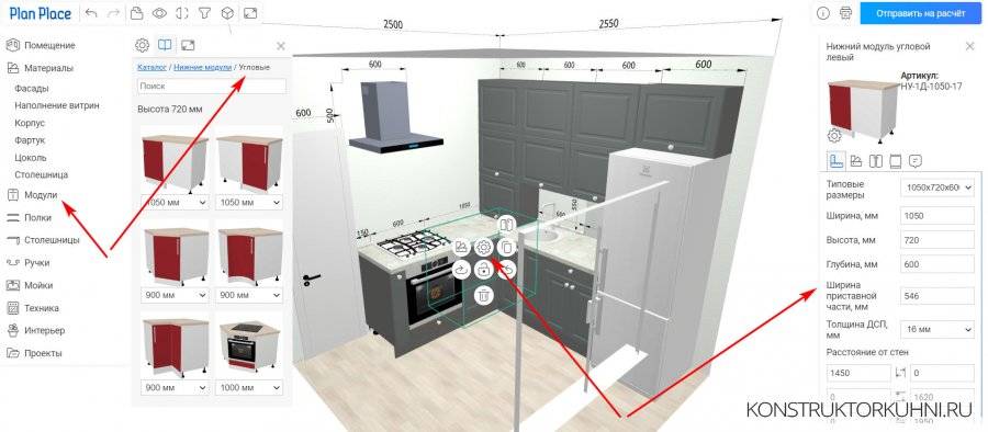 После того, как вы нарисовали кухню, вы можете узнать ее цену в Москве. Для этого нажмите на кнопку “Отправить на расчет”, после этого с вами свяжется менеджер московской мебельной компании.