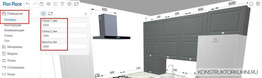Помещение – Размеры – Стена 1 и Стена 2, а также Высота (если у вас потолок не 2,5 метра)