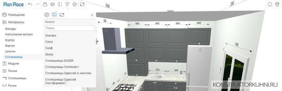 По умолчанию установлены общепринятые параметры – толщина столешницы, высота цоколя и фартука, но при необходимости их можно изменить.