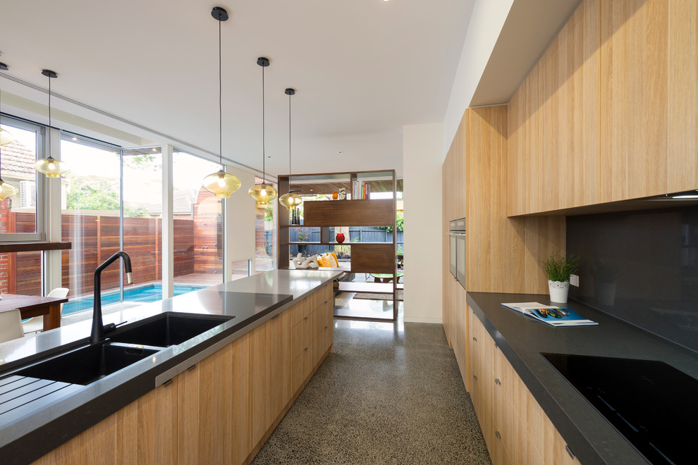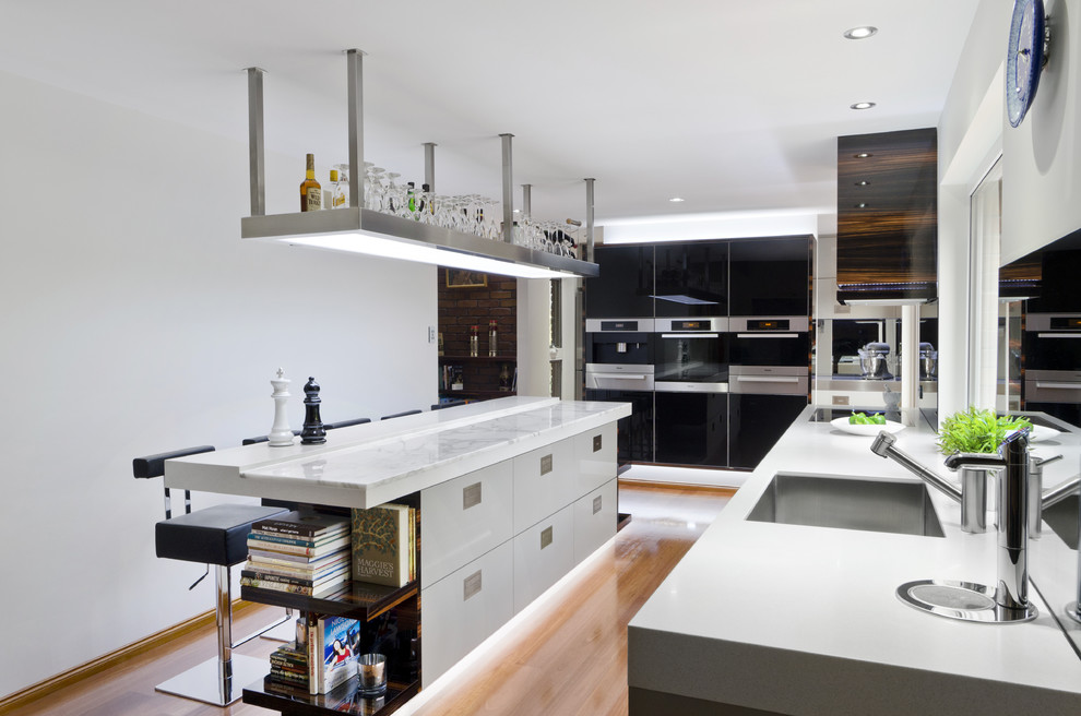 Еще один метод, который лучше доверить профессиональным ремонтникам — встроить раковину в один уровень со столешницей. Таким образом кухонный гарнитур смотрится единым монолитным элементом.