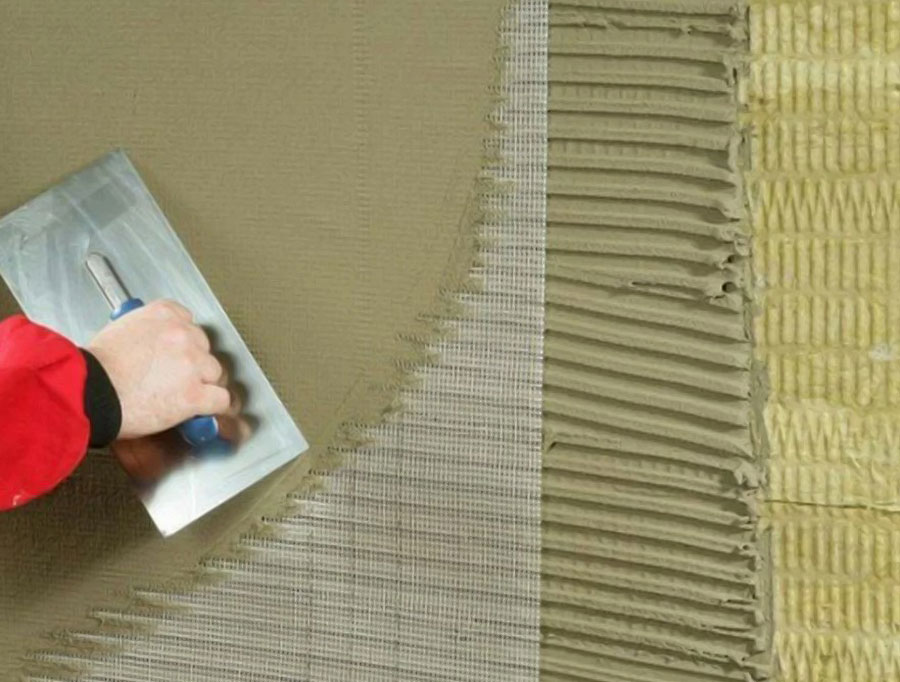 фиксация армирующей сетки. Даже после обработки грунтовкой сцепление между штукатуркой и плитами утеплителя остается незначительным. Чтобы устранить этот эффект, в один или два слоя на поверхность теплоизоляции фиксируется стеклосетка;